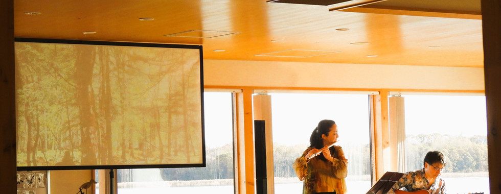 演奏の背景には、ラムサール条約登録湿地である広大な濤沸湖の情景が広がりました。作編曲家・ギタリストの本田優一郎さんとフルートの谷藤万喜子さんが織りなす繊細で力強いハーモニーは、湖畔の景色と見事に一体化し、自然の偉大さと音楽の持つ力を感じさせてくれました。